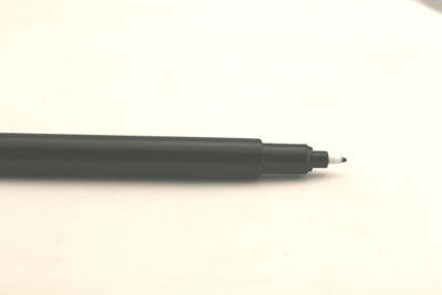 Oggetto a punta sintetica o a punta plastica poliacetalica estrusa. Il pennino estruso di color nero presenta una punta aguzza disegnata allo scopo di sfruttare il flusso di inchiostro sulle sue estremità e sui suoi lati. Il design si contraddistingue per la linea minimalista che determina un corpo meno allungato rispetto alla forma delle penne tradizionali; esso è sottile al punto giusto per permettere un'impugnatura ottimale. E' presente un tappo a forma di bombetta scelta per la sua essenzialità. Esso è caratterizzato da un bordino dentato: una rosa di sette piccoli aggetti realizzati al fine di rendere più facile l'appoggio su una superficie piana e per evitare che la penna si possa muovere. Una serie di piccoli fori è presente nel tappo. Sulla parte superiore del corpo vi è un'iscrizione e il logo dell'azienda produttrice colorati di bianco. Posizionato sull'estremità opposta del cappuccio, vi è un tappino posteriore anch'esso di colore nero che presenta una lieve ondulazione.