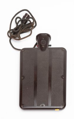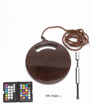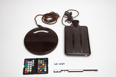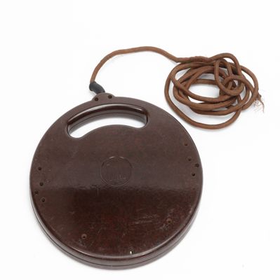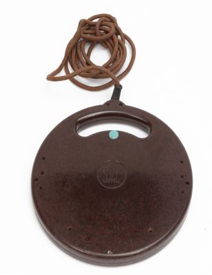 Coppia di scaldaletto in bachelite, uno tondo e uno a forma di borsa dell'acqua calda.