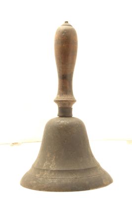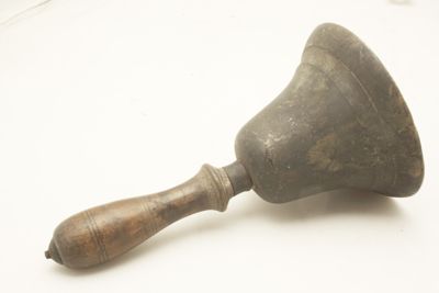 Campanello in bronzo di medie dimensione con manico in legno. All'interno è presente il batacchio in ferro dolce.