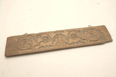 Forma in legno con riprodotti fregi a motivi floreali. Questa forma è contenuta con altre in gesso e in legno in una bacheca chiusa da un vetro.