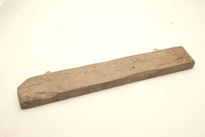 Forma in legno con riprodotti fregi a motivi geometrici e floreali. Questa forma è contenuta con altre in gesso e in legno in una bacheca chiusa da un vetro.