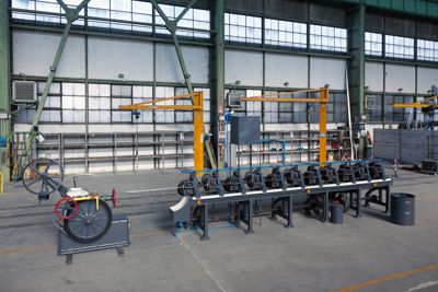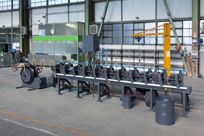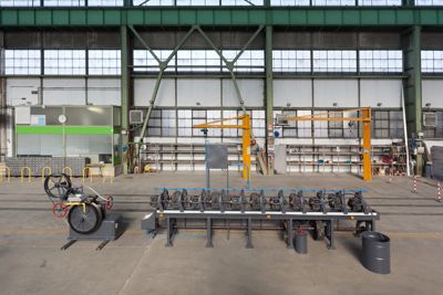 Macchina per la colata continua, prima parte del "Sistema CCR" (Continuous Casting and Rolling - Colata continua in conchiglia chiusa e laminazione diretta). La macchina è composta da una "ruota di biciletta modificata", una vaschetta per l'alimentazione del piombo, una puleggia, un sistema di raffreddamento ad acqua e un motore elettrico.