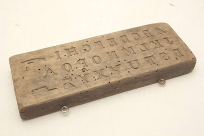 Forma in legno con riprodotta su un lato la scritta "ANTONIO COMERIO FUSE" con le cifre 1, 2 , 3, 4, 5, 6, 7,8 ,0, sull'altro lato le lettere dell'alfabeto dalla A alla Z e due mani che indicano in direzioni opposte. Le scritte sono a rovescio. Questa forma è contenuta con altre in gesso e in legno in una bacheca chiusa da un vetro.