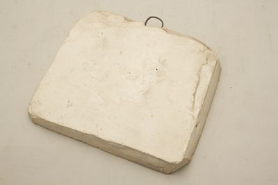 Forma in gesso con riprodotta un'immagine in negativo. Questa forma è contenuta con altre in gesso e in legno in una bacheca chiusa da un vetro.