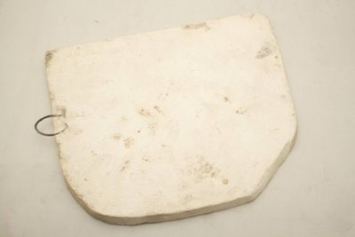 Forma in gesso con riprodotta un'immagine in negativo. Questa forma è contenuta con altre in gesso e in legno in una bacheca chiusa da un vetro.