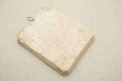 Forma in gesso con riprodotta un'immagine in negativo. Questa forma è contenuta con altre in gesso e in legno in una bacheca chiusa da un vetro.