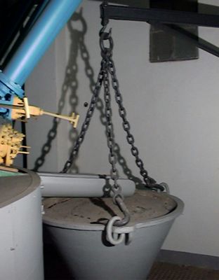 Siviera di metallo rivestita in materiale refrattario. A forma conica, con ganci e catene che la tengono unita al forno a vento.
