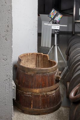Tinozza di doghe di legno, con manici, cerchiate di ottone.