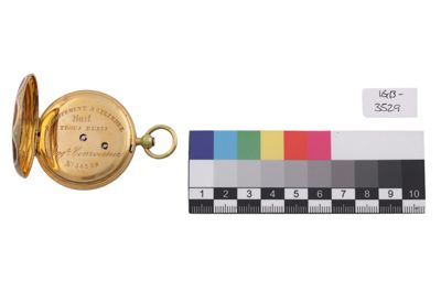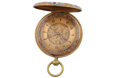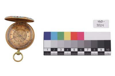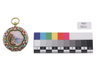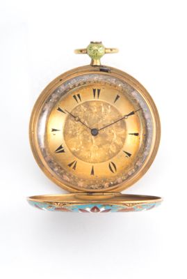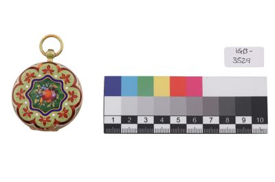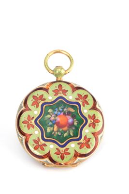 Cassa in quattro parti: fondo decorato a smalto, cuvette liscia con incisione documentaria e due fori di carica, carrure godronata dipinta a smalto e lunetta chiusa con decorazione a smalto. Pendente sferico dipinto a smalto con collo cilindrico e anello circolare inserito a pressione.