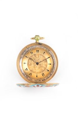 Quadrante d'oro con indicazione delle ore in turco. Al bordo del quadrante e al centro incisioni decorative con soggetto floreale. Lancette Breguet.