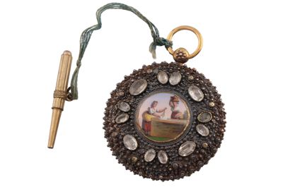 Orologio da tasca in oro, piccola miniatura e pietre dure - Moricand à Genève, 1800 circa - Svizzera