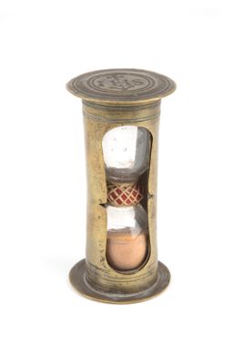Orologio a sabbia con montatura cilindrica in ottone. Le dimensioni e la forma rendono l'oggetto adatto al trasporto.