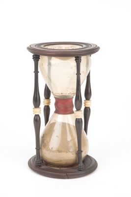 Orologio a sabbia con montatura in legno con quattro pilastrini a doppia colonna con giunto di avorio. Base con disco di avorio centrale con scanalature concentriche.