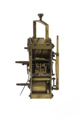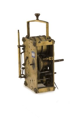 Struttura con forma a parallelepipedo principalmente di ottone e parti realizzate in ferro. Platine anteriore e posteriore quadrangolari raccordate da sostegni a sezione quadrangolare agli angoli. La platina posteriore è dotata di lamine a decoro traforate e incise a motivo fitomorfo con andamento a voluta: rameggi uniti a boccioli, fogliame e fiori, sia a contatto sia a sbalzo, piazzati a ornamento dei congegni. regolazione della suoneria con ghiera dentellata e numerazione in cifre arabe sulla cornice esterna. Sul lato sinistro piccolo elemento tornito a balaustro fissato a una sola platina. Sul lato destro piccola piastra traforata e incisa con motivo che riprende il decoro della platina. Maniglia per il trasporto a sezione quadrangolare fissata ad angoli opposti superiori. Pomolo modanato sommitale. Quadrante e indicazione delle ore mancanti. Scappamento a verga regolato da bilanciere. Bariletti fissi e lisci. Conoiode a catena. Carica a chiavetta.