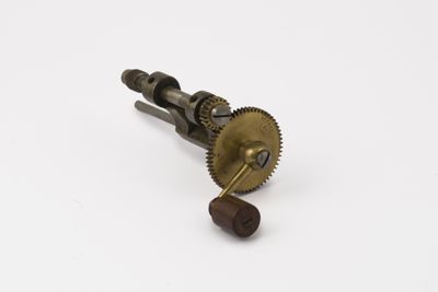 Struttura di ferro, a ponte rovesciato, terminante con guide passanti. Il meccanismo è azionato da manovella di ottone con braccio rettilineo e pomolo cilindrico terminale di legno. Ingranaggio a ruote dentate di ottone solidale alla manovella. Fissabile in morsa. Iscrizione: "Depose/ 25/ France"