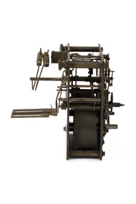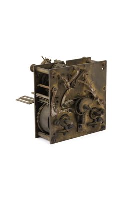 Struttura con forma a parallelepipedo principalmente di ottone e parti realizzate in ferro. Platine anteriore e posteriore quadrangolari raccordate da sostegni di ottone cilindrici fissati agli angoli. Entrambe le platine, prive di elementi decorativi, riportano il numero di serie della produzione, posto in basso al centro "2437421". Sulla platina posteriore il marchio di produzione, composto da diversi elementi incisi: scritta centrale alta P 54; scritta centrale sottostante su tre livelli D. P. R./ N°/ 177600; sul lato sinistro bollo con scritta GUSTAV BECKER/ G B/ FREIBURG/ IN SCHL. (rispettivamente lungo il margine alto il nome, al centro le iniziali a coronamento di ancora centrale, lungo il margine basso il luogo di produzione). Sul lato destro un altro bollo con scritta MEDAILLE D'OR intervallata da punzoni stellati, intorno a elemento a croce. Bariletti fissi. Scappamento a verga regolato da pendolo. Carica a chiavetta.