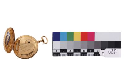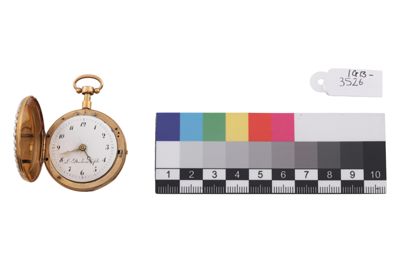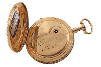 Cassa in quattro parti: fondo inciso con bordo di perle, cuvette liscia con foro di carica, carrure godronata e lunetta chiusa incisa come il fondo con bordo di perle. Pendente a disco con collo cilindrico a pressione per l'attivazione della ripetizione e anello ovale fissato con vite.
