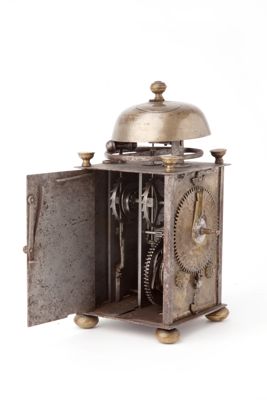 Cassa ad edicola, sormontata agli angoli da quattro coppe, Quadrante rotante diviso in 24 ore, cifre arabe rivolte all'esterno. Decorazione con testa d'angelo nella parte alta, due fiori ai lati, in basso, e una conchiglia alla base. L'indice di una mano nella parte bassa del quadrante permette la lettura delle ore. Un indice centrale consente la regolazione della sveglia. Movimento solo tempo con sveglia. Scappamento a verga con bilanciere anulare