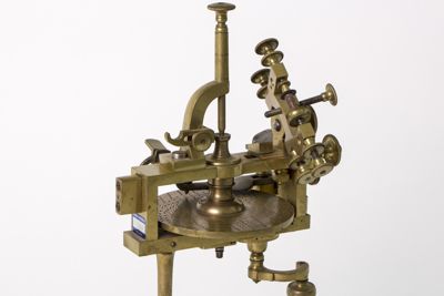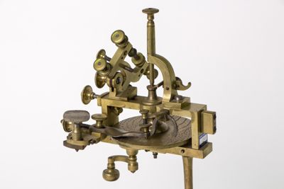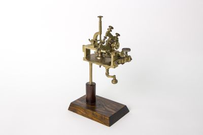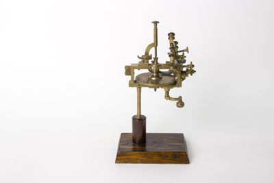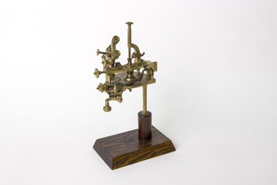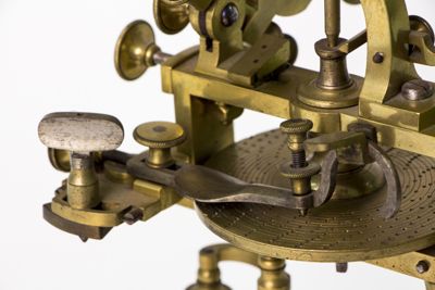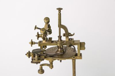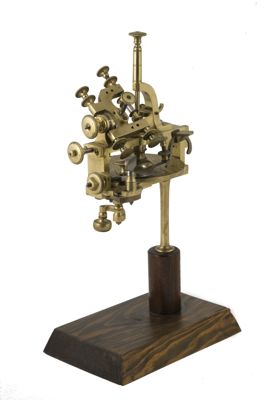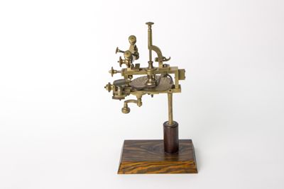 Telaio portante composto da barra orizzontale sormonata da supporto a ponte. Piattaforma rotante posizionata sulla barra orizzontale, azionabile con meccanismo a manovella, dotata di braccio ricurvo con attaco e pomolo terminale modanati, posizionati sotto la barra stessa. Dipositivo centrale alla piattaforma modanato e bombato alla base. Alidada di ferro a profilo curvo, con incavo iniziale. Carro scorrevole sulla barra portante superiore (allontanabile o avvicinabile al centro su cui è fermata la ruota da intagliare) mediante meccanismo a cursore. È articolabile a cerniera anche in posizione obliqua. Fresa azionata tramite archetto, la cui corda è avvolta su puleggia. Fermo della ruota con montante ricurvo. Viti (fa eccezione quella ellittica a corredo dell'alidada) con testa circolare leggermente bombata e profilo zigrinato con linee incise oblique. Struttura posta su sostegno tubolare verticale, realizzato in ottone, innestato entro supporto ligneo non pertinente composto da base cilindrica lignea, a sua volta fissata su basamento quadrangolare in legno.