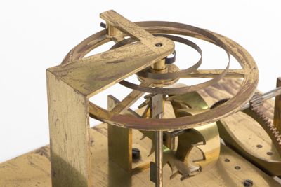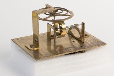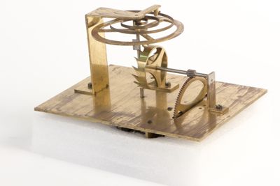 Modello didattico costruito per mostrare il funzionamento dello scappamento a verga o a palette. E' montato su tavoletta di ottone e dotato, originariamente, di un motorino posto sotto la base che garantiva la forza motrice all'ingranaggio. Lo scappamento è regolato da una bilanciere a spirale piana.