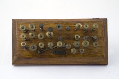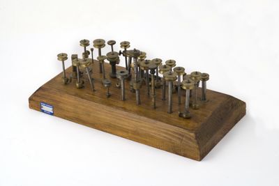 Alberi di metallo, differenti per dimensione, alloggiati in verticale entro tavola di legno con alto spessore e spigoli tagliati. Sulla superficie superiore del sostegno si contano trentuno piccoli fori circolari, con relativo canale, atti a contenere i pezzi. Centrale sul fronte, probabile conio quadrangolare di ferro per lancetta destinata a orologi di piccole dimensioni.