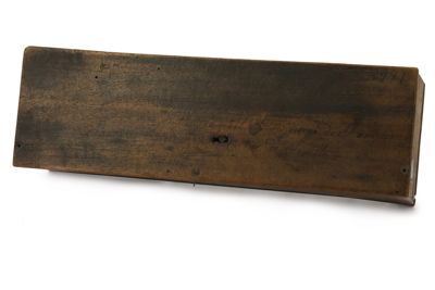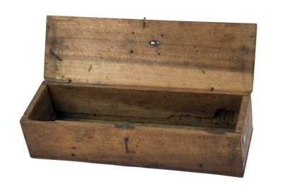 Semplice scatola di legno composta mediante assemblaggio di piccole assi squadrate con incastro a coda di rondine. Coperchio apribile per mezzo di cerniera ad anelli in ferro sul lato lungo. Chiusura ad anello su lato opposto con gancio a "L" posto sul fronte esterno. Sul coperchio si intravede scritta su più righe e numero posto in alto a destra "ecco la man di m [...] sto a nel [...] giorno di pass [...] / largo al factotum d [...] de se [...] villo [...] / A.B.HAMT; 2971". All'esterno, sul lato sinistro, si leggono cifre intervallate da barra. Sul fondo si trovano: un chiodo pertinente, quattro viti, tre piedini in rame. Sul lato sinistro si trovano un foro passante circolare e, alla base, tre fori quadrangolari occlusi da carta. Sul coperchio, in basso a sinistra, si individua etichetta di carta.