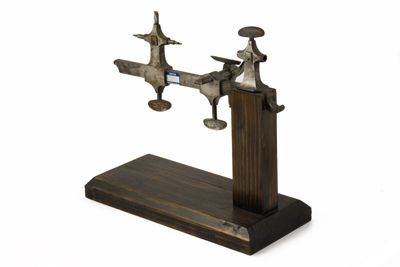 Struttura di ferro costituita da barra orizzontale (albero principale della macchina) a sezione quadrangolare, sulla quale si inseriscono il supporto della contropunta, scorrevole, il supporto fisso con punta passante, e il sostegno del bulino (utensile tagliente), scorrevole, posto fra primi due. Viti per il fissaggio a lamina piatta con forma ellittica. Il pezzo è retto da unico sostegno ligneo non pertinente, composto da barra verticale a sezione quadrangolare fissata su piattaforma rettangolare caratterizzata da spigoli superiori tagliati e stondati.