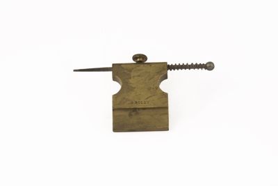 Guida di ottone, a lamina piatta, sagomata sui due lati. Nella parte superiore traversata da asta di ferro appuntita, fermata in posizione da vite con testa circolare piatta con profilo zigrinato. Da inserire entro supporto. Nome inciso su un lato, iscrizione: "G. Boles". Oggetto accompagnato da un ulteriore oggetto composto da un cordino legato ad un gancio in metallo.