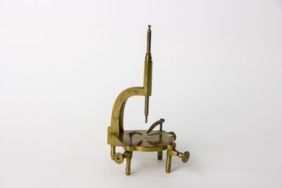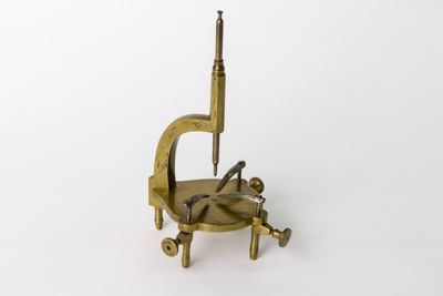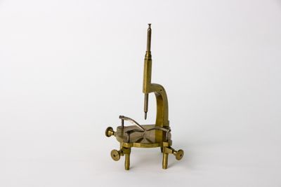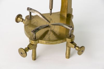Struttura pricipalmente di ottone con parti di ferro. Braccio ricurvo a sezione quadrangolare reggente guida verticale a sezione poligonale, con puntale modanato, traversata da asta acuminata scorrevole. Piattaforma circolare con tre fermi di ferro muniti di albero verticale ospitato entro estroflessioni lobate della stessa. I fermi sono regolabili in altezza mediante viti poste all'estremità di tre dei quattro piedi che la sostegono, con foggia a colonnina, leggermente sagomata. Viti di fissaggio a testa circolare e profilo con zigrinatura a canestro.