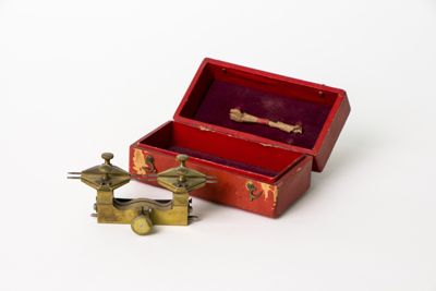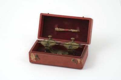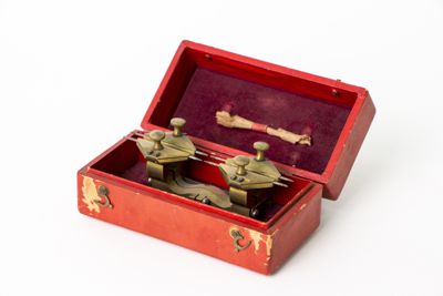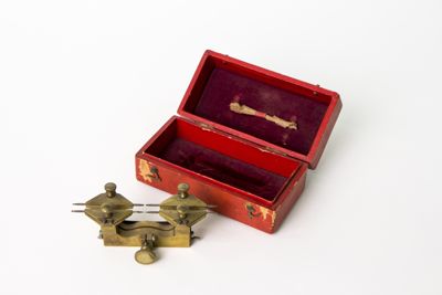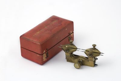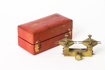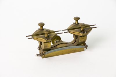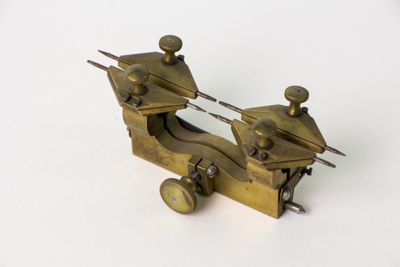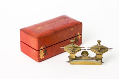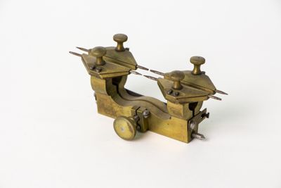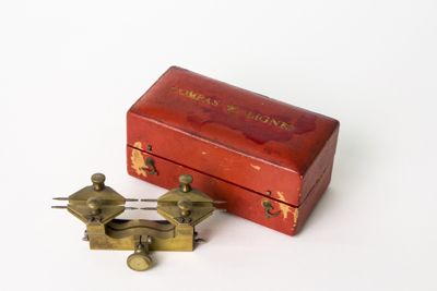 L'utensile, realizzato principalmente in ottone, include rari elementi in ferro. È costituito da telaio portante composto da due montanti con forma a ponte rovesciato uguali e affrontati, a sezione quadrangolare, tenuti insieme da cerniera basale. Sono distanziabili mediante vite centrale, dotata di testa circolare, posta su uno dei lati lunghi. Due barre di ottone con cursore posizionate sui due lati brevi, e una barra di ferro sul lato lungo agganciata alle prime due, contengono e fermano la divaricazione. I montanti si incurvano in prossimità delle guide fusiformi delle punte e contropunte - in totale quattro, due per parte - entro le quali avviene lo spostamento nei canali di scorrimento. Le punte sono fermate nella posizione scelta mediante viti con testa circolare leggermente bombata, e zigrinatura sul profilo ottenuta con righe oblique incise. Lo strumento, alloggiato entro astuccio rigido, è apribile mediante cerniera su uno dei lati lunghi e due piccoli ganci a uncino sul lato opposto. La custodia, rivestita di cuoio rosso, reca al centro del coperchio scritta oro in carattere maiuscolo. All'interno, rivestimento di velluto rosso. Il coperchio conserva punta suppletiva, avvolta entro carta, fermata da asola di tessuto rosso.