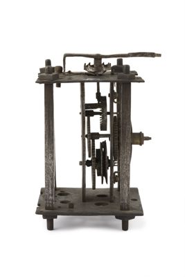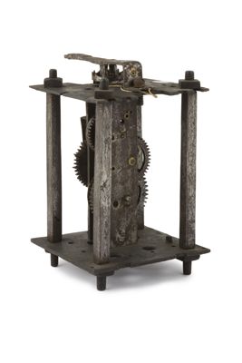 Struttura in ferro a quattro montanti a sezione quadrata. Scappamento a verga regolato da pendolo mancante. Movimento del tempo incompleto e completamente mancante quello della suoneria.