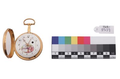 Cassa in due parti: fondo liscio e lunetta portavetro entrambi con decorazione floreale incisa sul bordo. Pendente a disco con lungo collo cilindrico a pressione per l'attivazione della ripetizione e anello ovale spinato.