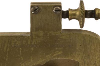 Struttura a ponte costituita essenzialmente da sostegno sagomato e piatto a sezione quadrangolare ospitante doppio sistema di viti, il primo dei quali, posto in basso, funge da cerniera per la macchina inv. 3665, mentre il secondo, serve a imprigionare l'albero rotante. Viti con testa circolare, leggermente bombata, e zigrinatura sul profilo. Iscrizione "Alexandre Bertolla"