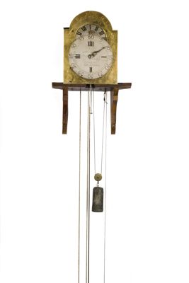 Orologio da parete in ottone con suoneria delle ore al passaggio e ripetizione a richiesta di ore e quarti su campane per le ore e i quarti. Scappamento ad ancora con pendolo da secondi. Indicazione delle ore in numeri romani con indice fisso e mostra rotante, entro lunetta posta nella parte alta del quadrante. Indicazione dei quarti in numeri romani e dei minuti in cifre arabe di cinque in cinque su quadrante in argento. Falsa piastra di supporto in ottone con decorazione incisa a motivo floreale con rami fogliati di raccordo. Presente iscrizione sul quadrante "Questo orologio/ lideai e lo feci/ nella mia avanzata/ età d'anni. 80./ Bortlo Ant° Bertolla"