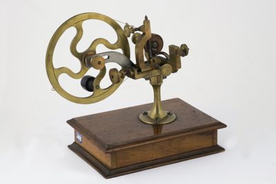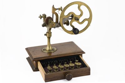 Macchina "pour arrondir" a contropunte verticali. Struttura principalmente di ottone e rari inserti di ferro, retta da albero verticale con fusto e base a sezione circolare. Il sostegno è a sua volta fissato su piattaforma rettangolare di legno. Fresa e solidale puleggia azionate da volano mosso mediante pomolo ligneo fissato all'estremità esterna di uno dei raggi, che sono ricavati da lamina piatta e hanno andamento curvilineo. Il volano è a sua volta fermato su braccio munito di cursore- regolatore di distanza. Viti con testa circolare leggermente bombata, con profilo zigrinato a rigatura incisa obliqua. Il supporto ligneo quadrangolare che regge la struttura ha il piano superiore e la base modanati e aggettanti sul profilo. È dotato di cassetto apribile con pomolo ligneo tornito posto sul fronte. All'interno corredo di frese posizionate nei rispettivi alloggiamenti, presenti 13 utensili per arrondire e 23 dischetti.