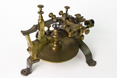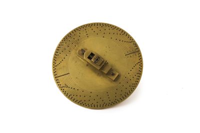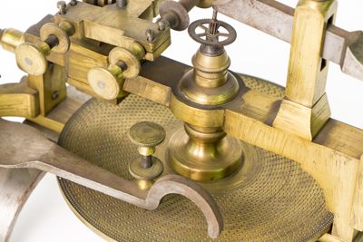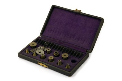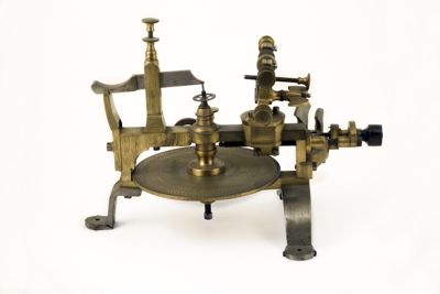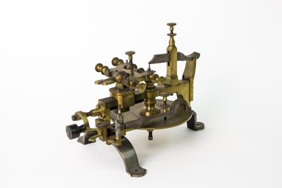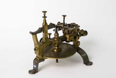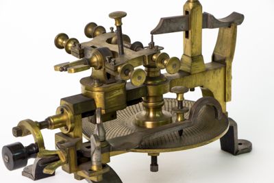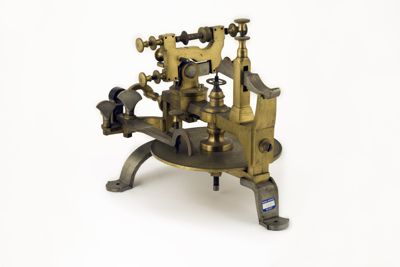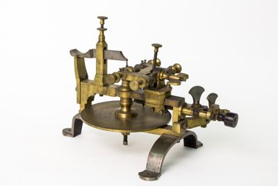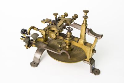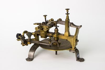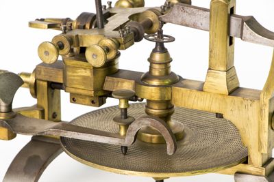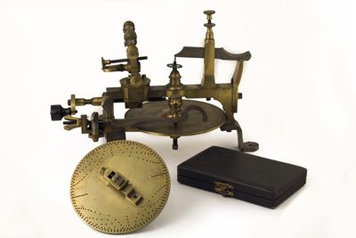 Struttura della macchina, principalmente di ottone, montata su sostegni fissabili mediante viti al piano del tavolo. Piattaforma di ottone con dispositivo centrale modanato e sagomato con piede a base cilindrica. Alidada di ferro a profilo curvo e concavità iniziale. Carro montato sulla barra portante superiore di scorrimento, allontanabile o avvicinabile al centro su cui è fermata la ruota da intagliare. È azionato mediante manovella (curvilinea al fondo, con pomolo ligneo terminale), posta sullo stesso asse della barra. Fresa azionata tramite archetto, la cui corda era avvolta su puleggia. Viti (fanno eccezione quelle a corredo dell'alidada, semicircolari, e a farfalla) con testa circolare leggermente bombata e profilo zigrinato con linee incise oblique. Tre sostegni piatti e arcuati, terminanti con piede semicircolare e foro centrale per l'ancoraggio al piano di lavoro, supportano la struttura: due dei tre piedi sono posti in posizione speculare l'uno rispetto all'altro, mentre il terzo, isolato, risulta in posizione centrale e ortogonale rispetto ai primi. La fresatrice è dotata di disco suppletivo, e astuccio completa di frese. L'astuccio è apribile con sistema a cerniera su un lato lungo e chiusura con mostra sagomata dorata sul lato opposto. Interno ricoperto con tessuto viola. Utensili di ricambio posti nei congrui alloggiamenti. L'astuccio è collocato sul ripiano 10b