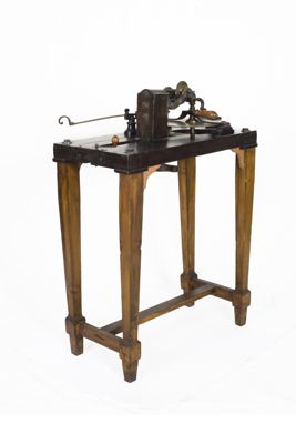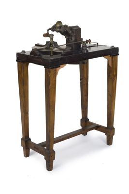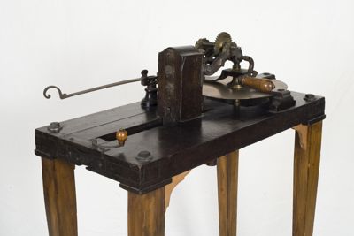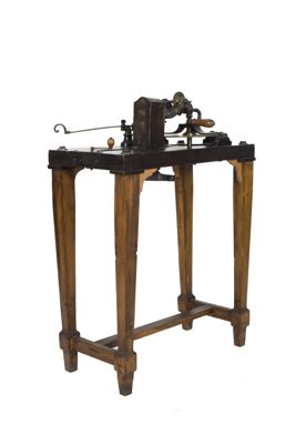 La piattaforma presenta dispositivo centrale modanato e sagomato, raccordato e fissato al tavolo di supporto mediante tre bracci metallici piatti e curvati. Il carro, posto a sostegno dell'asse rotante su cui è montata la fresa a disco, è ancorato a sostegno verticale con terminazione superiore curvilinea, anch'esso fissato al piano del tavolo. La fresa, macchinario articolabile verticalmente a cerniera, è allontanabile o avvicinabile al centro su cui è fermata la ruota da intagliare. La macchina è dotata di ingranaggio a manovella con braccio curvo e pomolo ligneo.