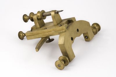 Struttura costituita da un sostegno di ottone a due corpi, ortogonali fra loro, dei quali il primo, sagomato a ponte, è incernierabile alla macchina, il secondo, quadrangolare, funziona da guida a un carrello con albero passante terminante a punta. Viti con testa circolare con profilo zigrinato. Punta di ferro scorrevole entro guida.