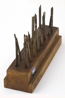 Sedici punte, differenti per tipologia e dimensione, alloggiate in verticale nei fori praticati entro tavoletta in legno con profilo a gradino, di fattura posteriore.