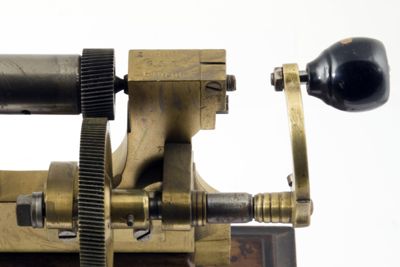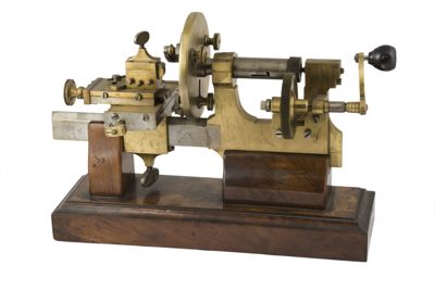 Macchina utensile principalmente realizzata in ottone con rari interventi in ferro. Costituita da struttura a sezione quadrangolare estesa in sostegni con profilo ricurvo e terminazioni - una delle quali con iscizione incisa - attraversate dall'ingranaggio tubolare terminante con piattaforma circolare rotante. Unita alla struttura di ottone la barra orizzontale di ferro reggente il carro a croce scorrevole, contrapposto alla piattaforma circolare rotante, fissato con vite a testa piatta ed ellittica. Circolari con profilo zigrinato le altre viti. Il moto degli opposti meccanismi è ottenuto mediante manovelle con braccio ricurvo e pomolo "a oliva". L'intera struttura è inserita entro supporto ligneo non pertinente, composto da due larghi sostegni a profilo curvo, a loro volta poggianti su base rettangolare con alto spessore.