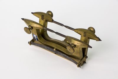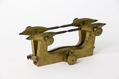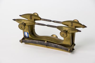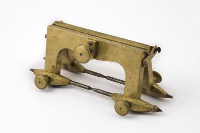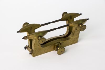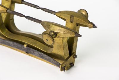 L'utensile, realizzato principalmente in ottone, include rari elementi in ferro. È costituito da telaio portante composto da due montanti con forma a ponte rovesciato uguali e affrontati, a sezione quadrangolare, tenuti insieme da cerniera basale. Sono distanziabili mediante vite centrale, dotata di testa circolare, posta su uno dei lati lunghi. Due barre di ottone con cursore posizionate sui due lati brevi, e una barra di ferro sul lato lungo agganciata alle prime due, contengono e fermano la divaricazione. I montanti si incurvano in prossimità delle guide fusiformi delle punte e contropunte - in totale quattro, due per parte - entro le quali avviene lo spostamento nei canali di scorrimento. Le punte sono fermate nella posizione scelta mediante viti con testa circolare leggermente bombata, e zigrinatura sul profilo ottenuta con righe oblique incise.