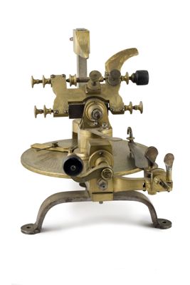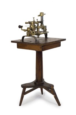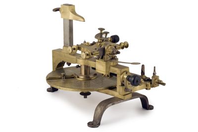 Struttura della macchina, realizzata principalmente in ottone, montata su sostegni fissati con viti al piano del tavolo. Piattaforma di ottone con dispositivo centrale modanato e sagomato. Alidada di ferro, piatta, a profilo curvo. Il carro, scorrevole sulla barra portante superiore mediante azionamento a manovella (curvilinea con pomolo terminale ligneo), è articolabile verticalmente a cerniera, allontanabile o avvicinabile al centro su cui è fermata la ruota da intagliare. Riporta sulla superficie nome inciso "Fait pour/ Alexandre Bertolla". Fresa azionata tramite archetto, la cui corda era avvolta su puleggia. Viti (fanno eccezione quelle a corredo dell'alidada, ellittiche e a farfalla) con testa circolare leggermente bombata e profilo zigrinato con linee incise oblique. Tre sostegni piatti e arcuati, terminanti con piede semicircolare e foro centrale per l'ancoraggio al piano di lavoro, supportano la struttura: due dei tre piedi sono posti in posizione speculare l'uno rispetto all'altro, mentre il terzo, isolato, risulta in posizione centrale e ortogonale rispetto ai primi. La macchina è corredata di un disco divisore suppletivo, e di pezzi intercambiabili utili alle diverse funzioni, alcuni dei quali riportanti nome inciso. La macchina è attualmente fissata su tavolo, inv. IGB-5834, con piano quadrangolare e una sola gamba con terminazione a tre piedi, non pertinente.