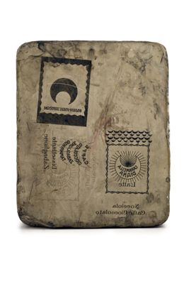 Pietra calcarea con superficie levigata e pareti ruvide. La superficie liscia è litografata. La pietra è sistemata su un espositore in legno.