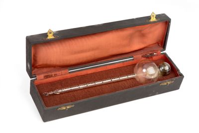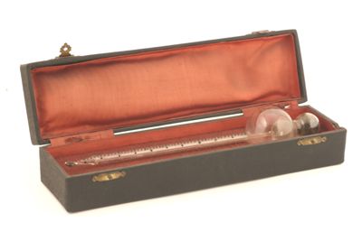 L'areometro è conservato in un astuccio in legno ricoperto in tessuto ed imbottito internamente.