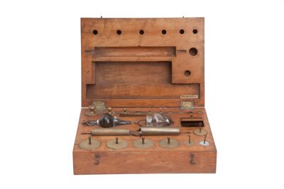 Lo strumento è contenuto nella sua scatola originale in legno. E' composto da vari pezzi tutti di dimensioni relativamente piccole. Tra questi, due tubicini cavi in ottone a sezione cilindrica chiusi ad una estremità. Uno di essi è leggermente più grande e possiede, dallo stesso lato ove è aperto, un piccolo archetto a forma di maniglia, forse utilizzato per la sospensione. Entrambi i tubicini dispongono di un piccolo gancio attaccato esattamente nel centro della base chiusa. Sono presenti molti pesi campione (circa una ventina) e due contrappesi in vetro di forma vagamente conica con struttura di sospensione in filo metallico. Vi è anche una pinzetta per la presa dei pesi più piccoli.