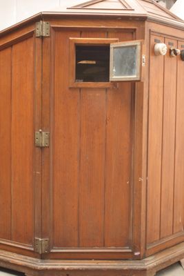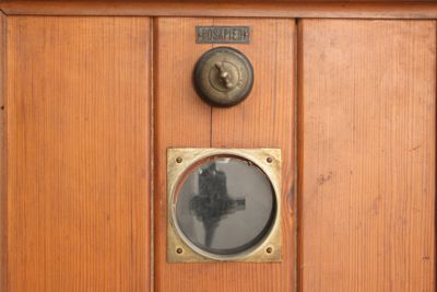 Sul terzo lato a destra dall'apertura è presente una finestrella (15,5x15,5 cm.); simmetricamente, sul terzo lato a sinistra dall'apertura, è posto uno spioncino munito di vetro e tappo a vite in ottone; in alto, sul lato orizzontale superiore, è praticata un'apertura circolare di 17 cm. di diametro.