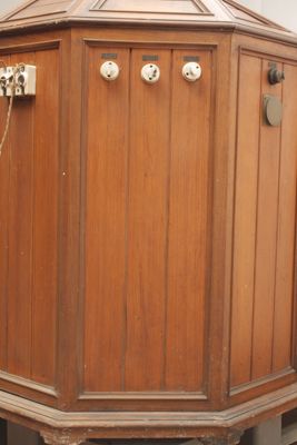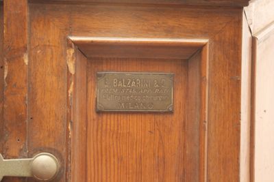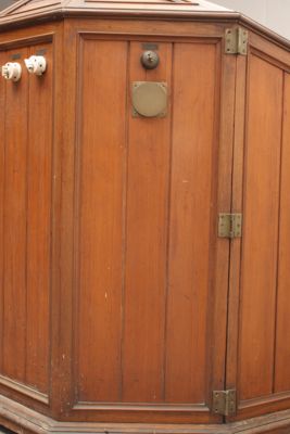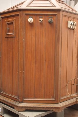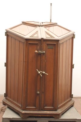 Le pareti sono mobili in modo da permettere l'entrata del paziente e sono serrate, quando l'apparecchio viene chiuso, da due chiavistelli (uno mancante) posti uno sopra e l'altro sotto rispetto a due maniglie collocate una su ciascun sportello (o parete mobile). Le maniglie e i chiavistelli sono in ottone.