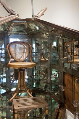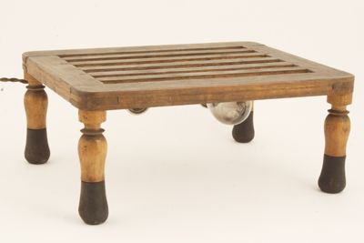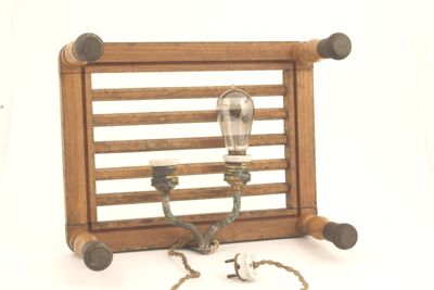 Sono presenti una sedia e un poggiapiedi munito di due portalampade con lampade a filamento di carbone.
