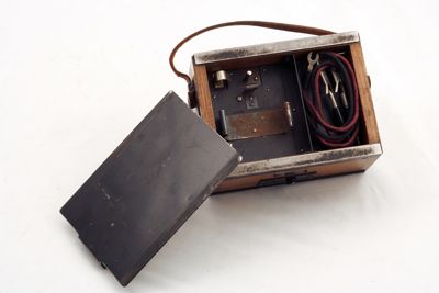All'interno del coperchio è incollato un foglio di carta sul quale è riprodotto lo schema elettrico dell'apparato insieme ad alcune istruzioni in tedesco. La scatola è dotata di maniglia in cuoio per facilitarne il trasporto.