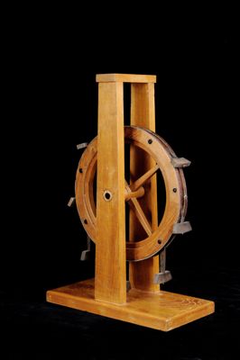Una ruota con struttura a raggi è mantenuta sollevata da terra e sorretta in posizione verticale da un supporto formato da due montanti. Questi si innestano su una base rettangolare di appoggio che ne assicura la stabilità. Sul bordo della ruota sono incernierati sette piccoli martelletti liberi di ruotare nel punto di innesto. L'oggetto, tranne che per i martelletti che sono metallici, è realizzato completamente in legno.